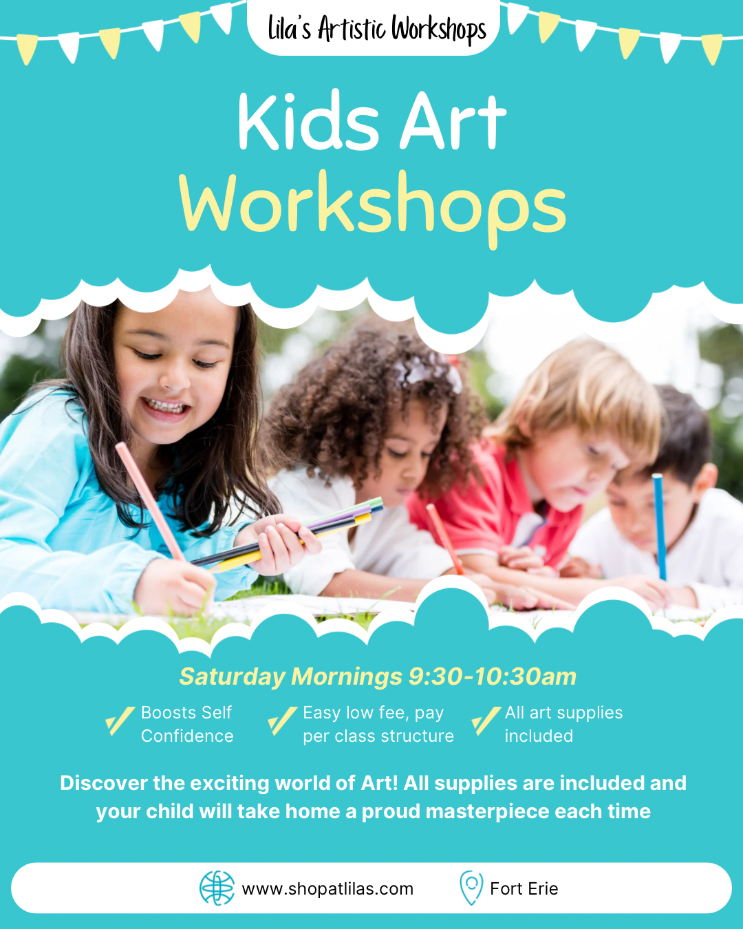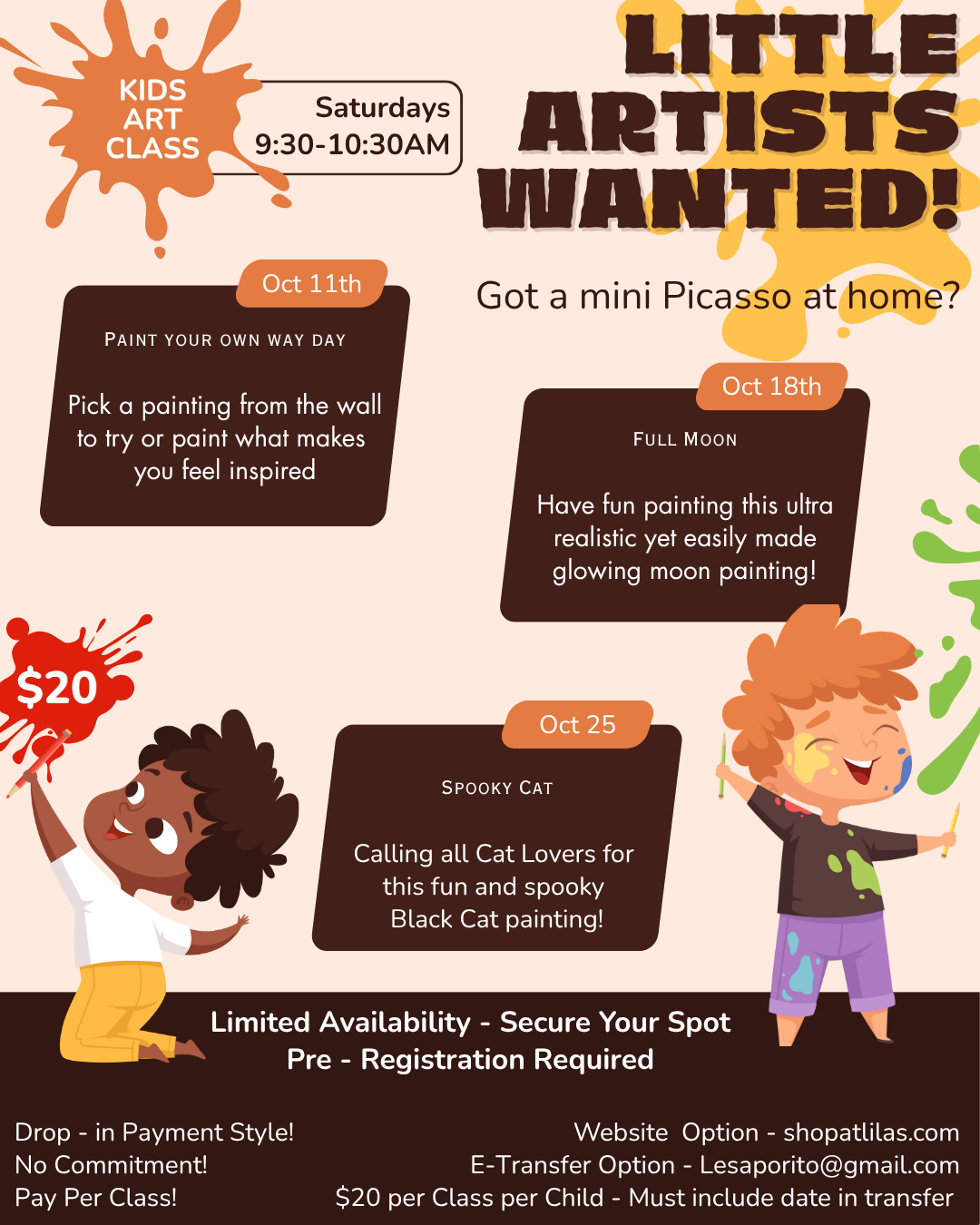 Categories: All Paintings Paint Classes Lila's Shop All | Paintings | Paint Classes | Ladies Paint Night Sale Price: $20.00 Original Price: $30.00 Sale Purchase Event Tickets Now Added! Saturday Morning Kids Art Workshops $20.00 Class Dates: Sat Oct 11 Sat Oct 18 Sat Oct 25 Sat Nov 1 Sat Nov 8 Sat Nov 15 Sat Nov 22 Sat Nov 29 Sat Dec 6 Sat Dec 13 Sat Dec 20 Add To Cart Added! 🍂 Fall Vibes Drop-In Painting Workshop 🎨 $25.00 Purchase Event Tickets Added! Custom Pet Portrait Canvas Paintings from $80.00 View Options Group Class Bookings from $100.00 Artist Number: Select Artist Number 4 5 6 7 8 9 10 11 12 13 14 15 16 17 18 19 20 21 22 23 24 25 26 27 28 29 30 31 32 33 34 35 36 37 38 39 40 Purchase Your Event! Added!